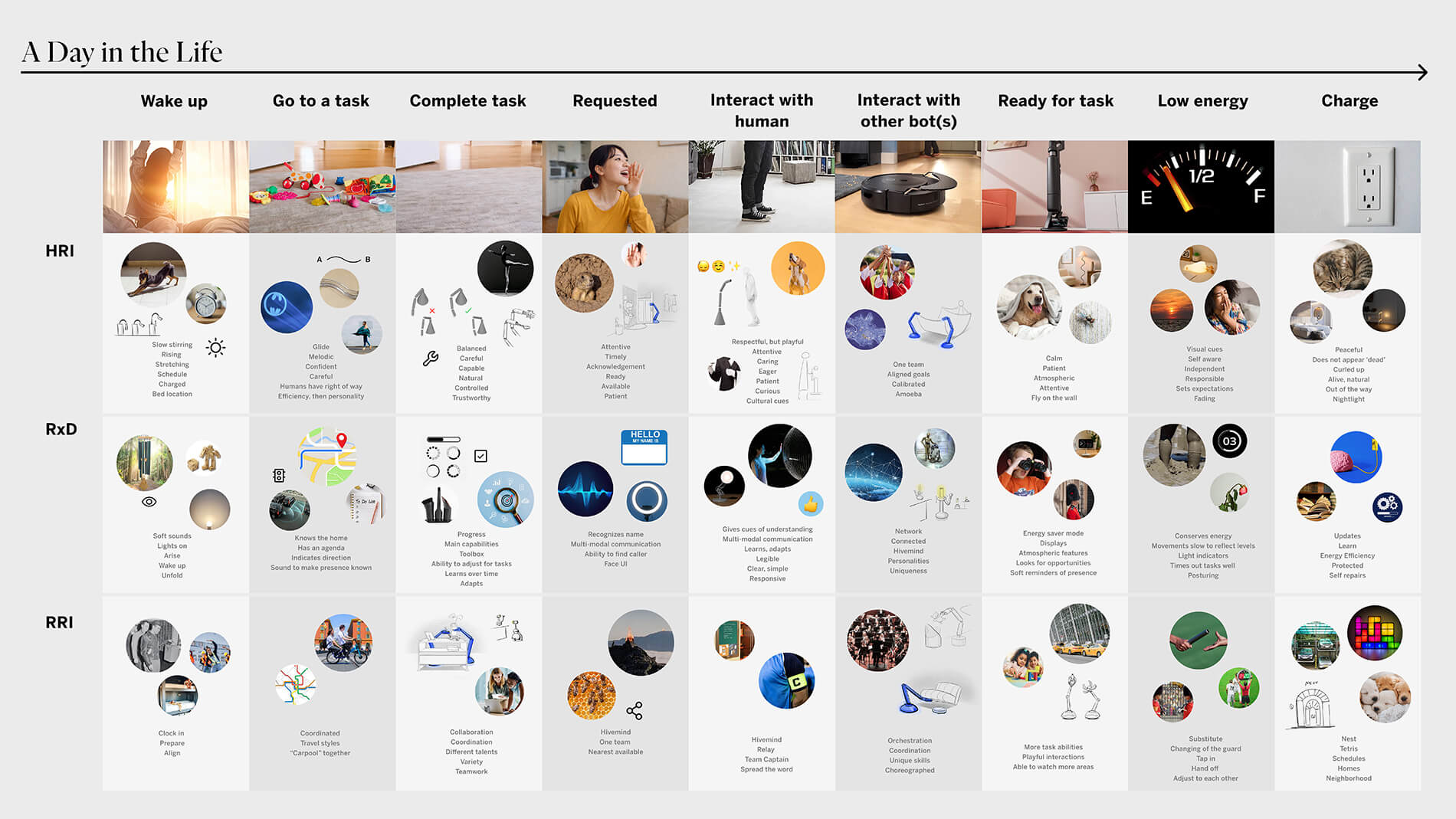Mapping a day in the life around this focus helped us uncover the key moments that define living alongside a robot. This included not just interactions with humans or objects, but also the in-between moments, like charging.